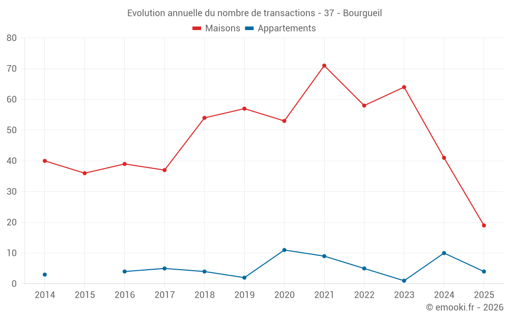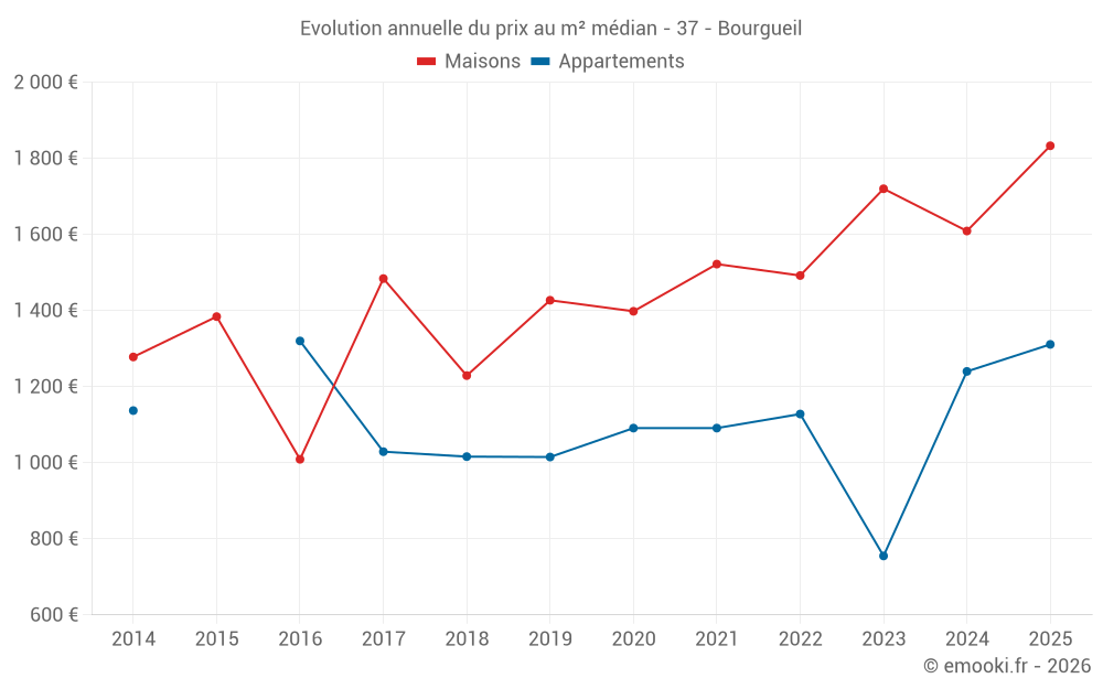 Le prix médian sur les 15 transactions d'appartements des 24 derniers mois dans la commune de Bourgueil était de 1 250 € par mètre carré pour une valeur foncière médiane de 60 000 €. Sur cette période 60% des transactions se sont situées entre 1 079 et 1 568 € par mètre carré (du 2ème au 8ème déciles).