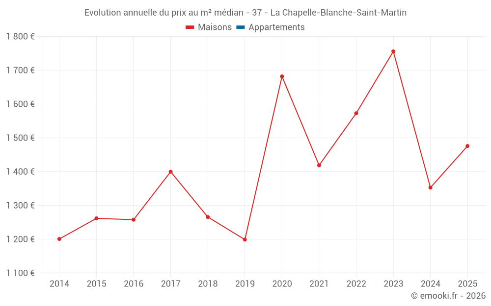 Le prix médian sur les 18 transactions de maisons des 24 derniers mois dans la commune de la Chapelle-Blanche-Saint-Martin était de 1 382 € par mètre carré pour une valeur foncière médiane de 139 500 €. Sur cette période 60% des transactions se sont situées entre 1 258 et 1 527 € par mètre carré (du 2ème au 8ème déciles).