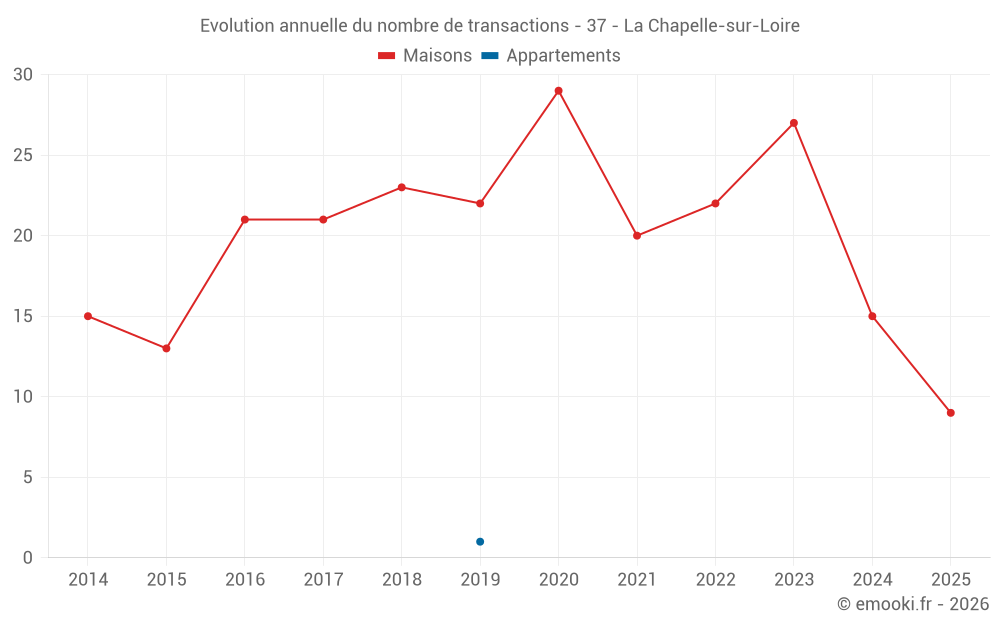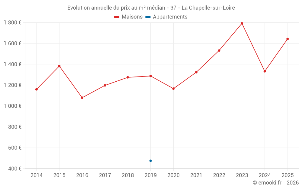 Le prix médian sur les 20 transactions de maisons des 12 derniers mois dans la commune de la Chapelle-sur-Loire était de 1 562 € par mètre carré pour une valeur foncière médiane de 115 000 €. Sur cette période 60% des transactions se sont situées entre 756 et 1 879 € par mètre carré (du 2ème au 8ème déciles).