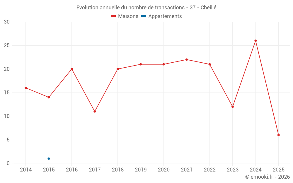 Le prix médian sur les 18 transactions de maisons des 12 derniers mois dans la commune de Cheillé était de 2 021 € par mètre carré pour une valeur foncière médiane de 166 500 €. Sur cette période 60% des transactions se sont situées entre 1 471 et 2 587 € par mètre carré (du 2ème au 8ème déciles).
