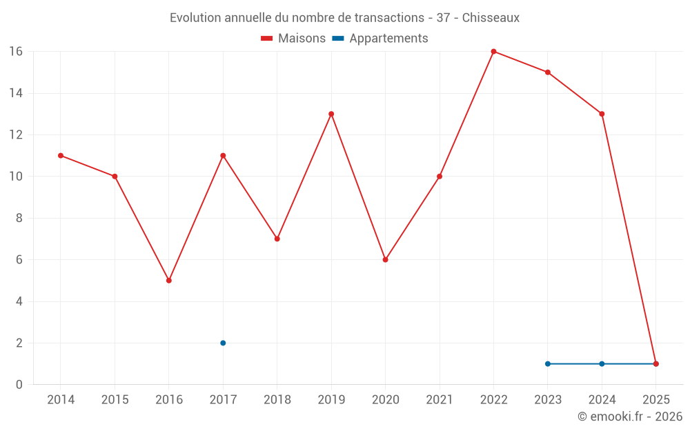 Le prix médian sur les 21 transactions de maisons des 24 derniers mois dans la commune de Chisseaux était de 1 753 € par mètre carré pour une valeur foncière médiane de 156 000 €. Sur cette période 60% des transactions se sont situées entre 1 477 et 2 062 € par mètre carré (du 2ème au 8ème déciles).