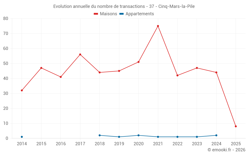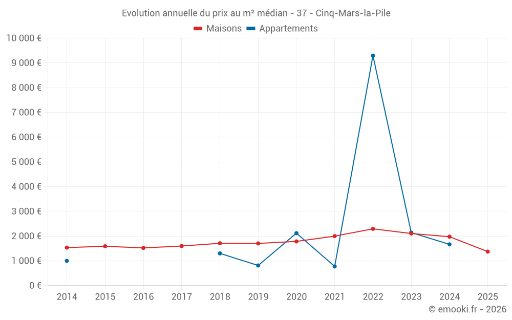 Le prix médian sur les 24 transactions de maisons des 12 derniers mois dans la commune de Cinq-Mars-la-Pile était de 1 658 € par mètre carré pour une valeur foncière médiane de 171 750 €. Sur cette période 60% des transactions se sont situées entre 1 340 et 2 459 € par mètre carré (du 2ème au 8ème déciles).
