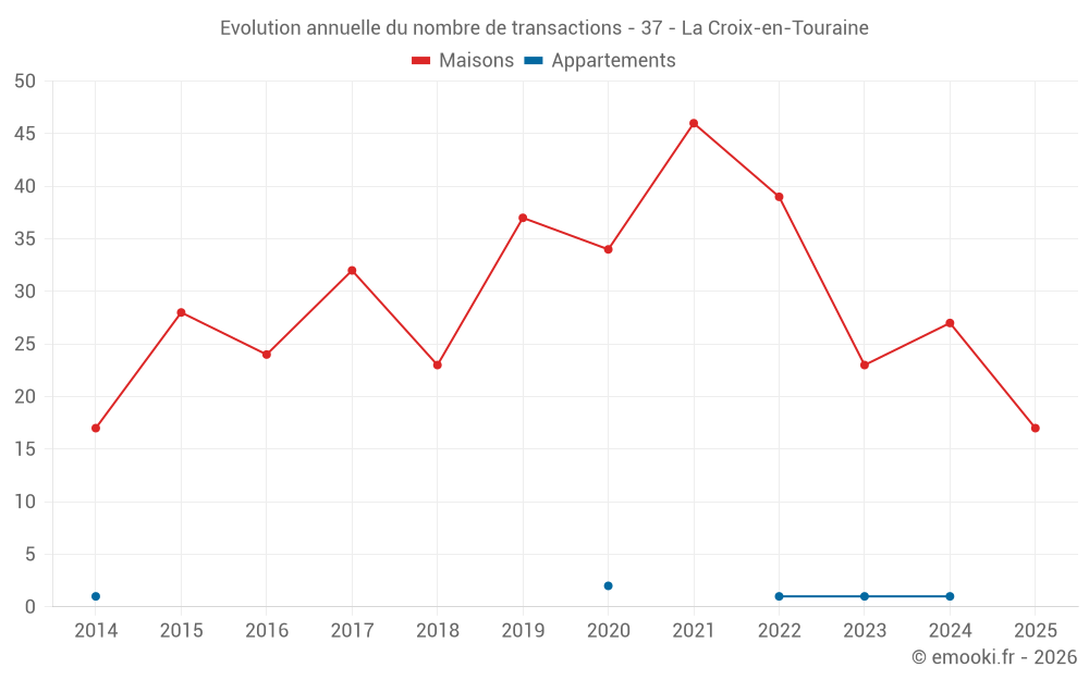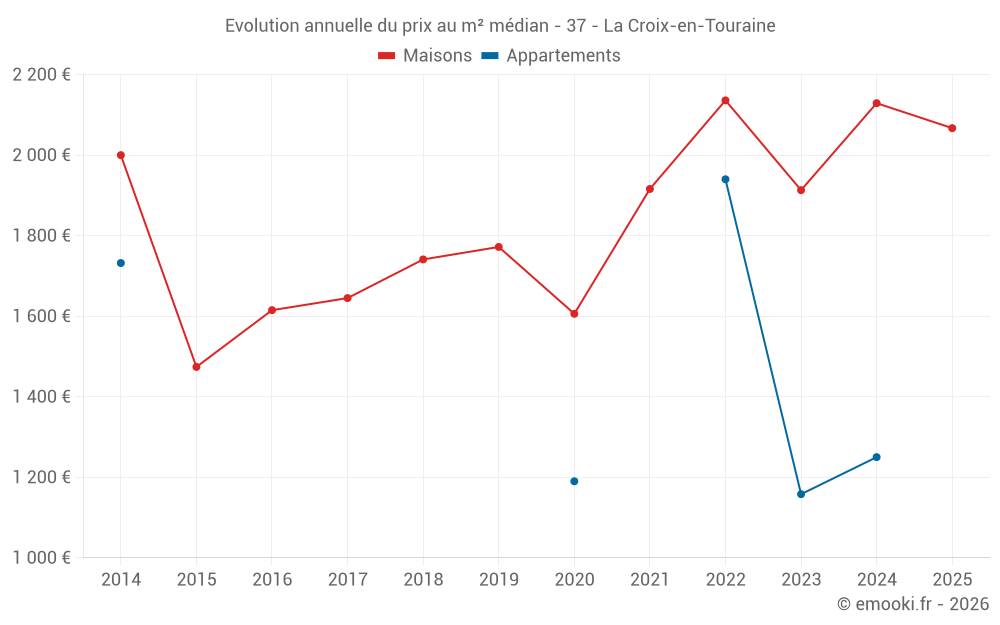 Le prix médian sur les 32 transactions de maisons des 12 derniers mois dans la commune de la Croix-en-Touraine était de 2 143 € par mètre carré pour une valeur foncière médiane de 203 755 €. Sur cette période 60% des transactions se sont situées entre 1 714 et 2 663 € par mètre carré (du 2ème au 8ème déciles).