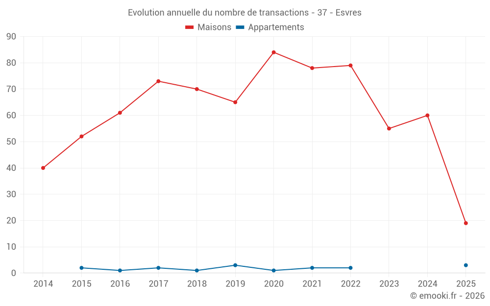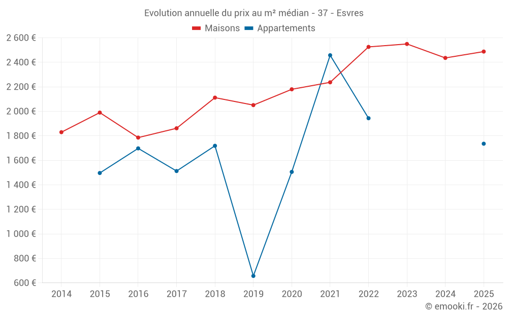 Le prix médian sur les 19 transactions de maisons des 6 derniers mois dans la commune d'Esvres était de 2 488 € par mètre carré pour une valeur foncière médiane de 237 000 €. Sur cette période 60% des transactions se sont situées entre 1 592 et 2 951 € par mètre carré (du 2ème au 8ème déciles).