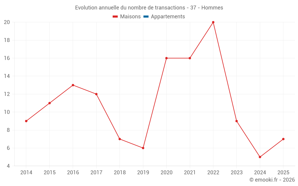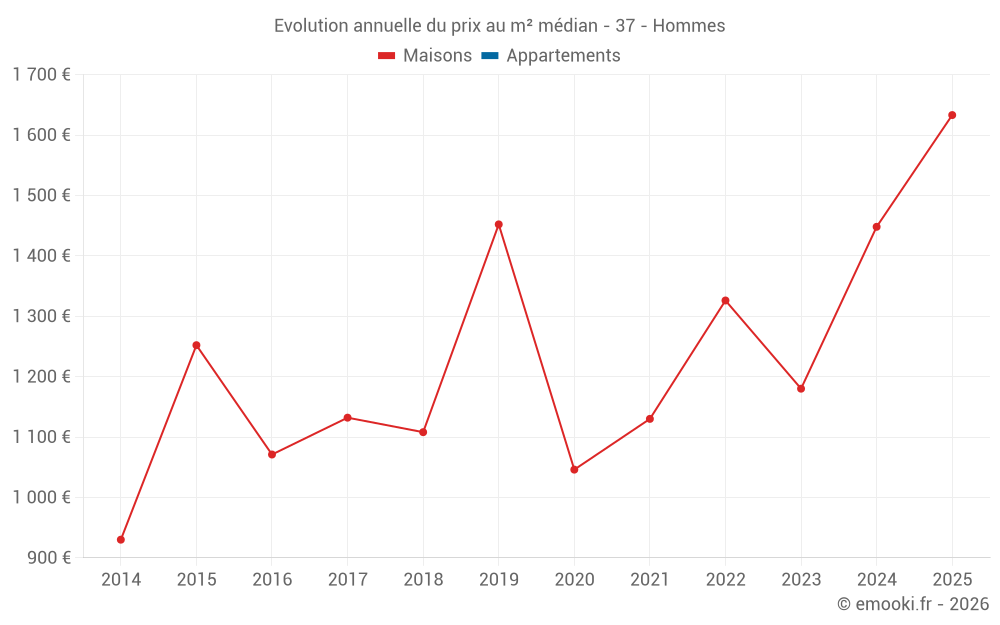 Le prix médian sur les 16 transactions de maisons des 24 derniers mois dans la commune d'Hommes était de 1 518 € par mètre carré pour une valeur foncière médiane de 165 000 €. Sur cette période 60% des transactions se sont situées entre 1 136 et 1 833 € par mètre carré (du 2ème au 8ème déciles).