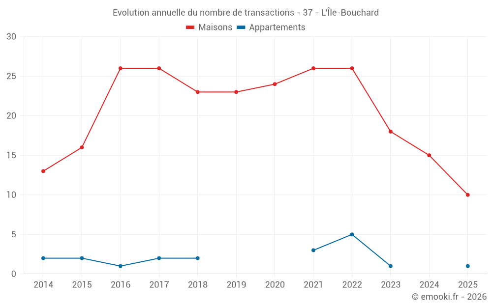 Le prix médian sur les 19 transactions de maisons des 12 derniers mois dans la commune de l'Île-Bouchard était de 1 246 € par mètre carré pour une valeur foncière médiane de 132 100 €. Sur cette période 60% des transactions se sont situées entre 960 et 1 538 € par mètre carré (du 2ème au 8ème déciles).