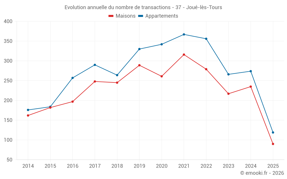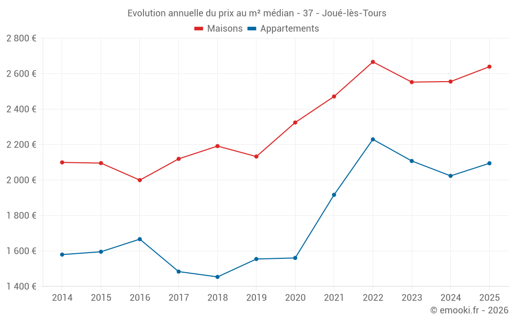 Le prix médian sur les 51 transactions d'appartements des 3 derniers mois dans la commune de Joué-lès-Tours était de 2 019 € par mètre carré pour une valeur foncière médiane de 97 000 €. Sur cette période 60% des transactions se sont situées entre 1 481 et 2 763 € par mètre carré (du 2ème au 8ème déciles).