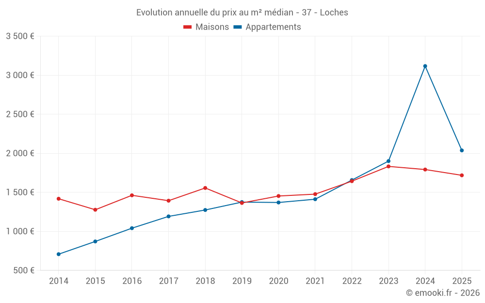 Le prix médian sur les 22 transactions d'appartements des 24 derniers mois dans la commune de Loches était de 1 859 € par mètre carré pour une valeur foncière médiane de 115 000 €. Sur cette période 60% des transactions se sont situées entre 1 417 et 2 860 € par mètre carré (du 2ème au 8ème déciles).