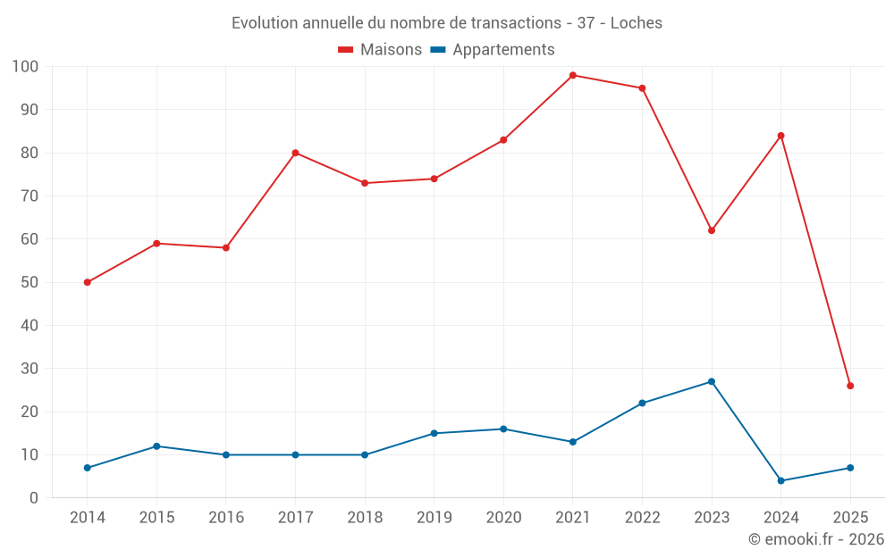 Le prix médian sur les 26 transactions de maisons des 6 derniers mois dans la commune de Loches était de 1 718 € par mètre carré pour une valeur foncière médiane de 167 500 €. Sur cette période 60% des transactions se sont situées entre 1 354 et 2 350 € par mètre carré (du 2ème au 8ème déciles).