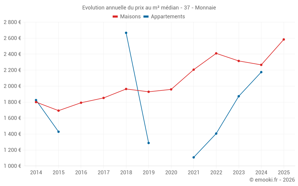 Le prix médian sur les 32 transactions de maisons des 12 derniers mois dans la commune de Monnaie était de 2 534 € par mètre carré pour une valeur foncière médiane de 232 250 €. Sur cette période 60% des transactions se sont situées entre 1 832 et 2 689 € par mètre carré (du 2ème au 8ème déciles).