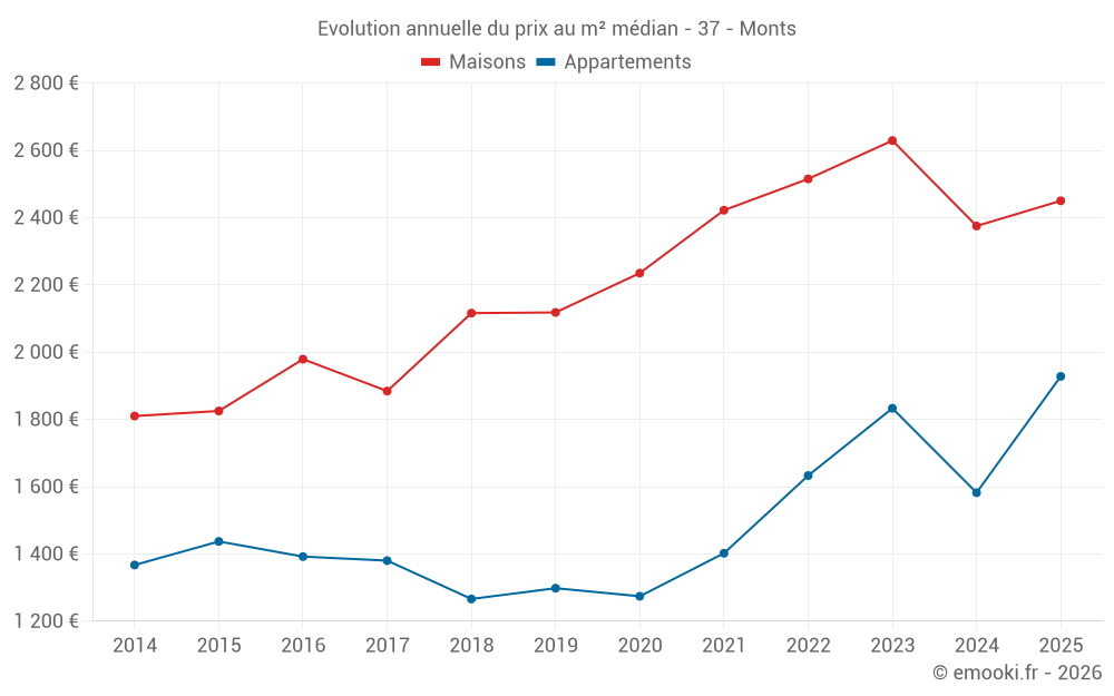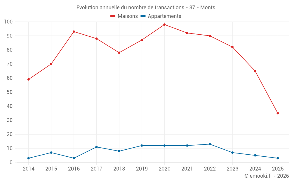 Le prix médian sur les 35 transactions de maisons des 6 derniers mois dans la commune de Monts était de 2 450 € par mètre carré pour une valeur foncière médiane de 230 000 €. Sur cette période 60% des transactions se sont situées entre 1 917 et 3 096 € par mètre carré (du 2ème au 8ème déciles).