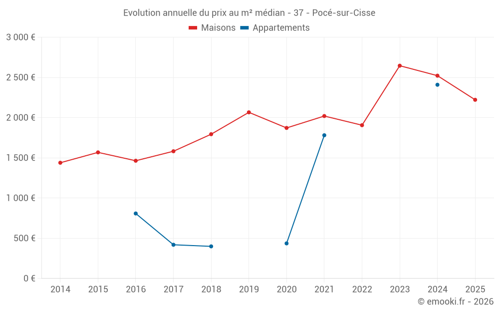 Le prix médian sur les 22 transactions de maisons des 24 derniers mois dans la commune de Pocé-sur-Cisse était de 2 612 € par mètre carré pour une valeur foncière médiane de 202 000 €. Sur cette période 60% des transactions se sont situées entre 1 783 et 2 989 € par mètre carré (du 2ème au 8ème déciles).