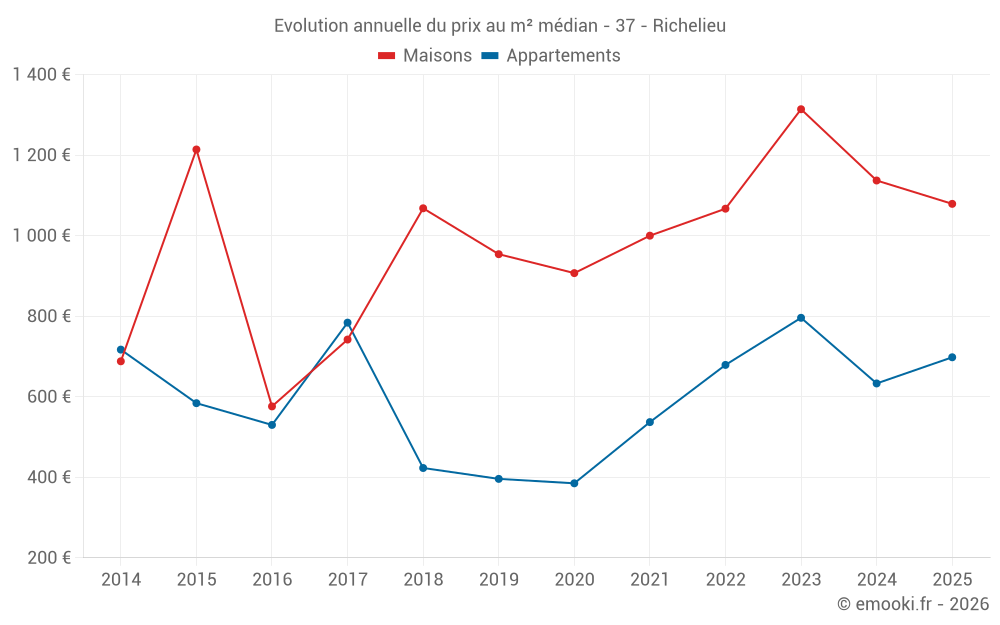 Le prix médian sur les 20 transactions de maisons des 12 derniers mois dans la commune de Richelieu était de 1 216 € par mètre carré pour une valeur foncière médiane de 106 700 €. Sur cette période 60% des transactions se sont situées entre 678 et 1 658 € par mètre carré (du 2ème au 8ème déciles).