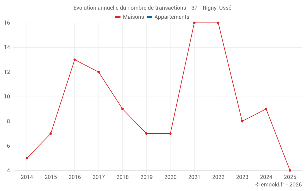 Le prix médian sur les 16 transactions de maisons des 24 derniers mois dans la commune de Rigny-Ussé était de 1 448 € par mètre carré pour une valeur foncière médiane de 167 500 €. Sur cette période 60% des transactions se sont situées entre 989 et 2 037 € par mètre carré (du 2ème au 8ème déciles).