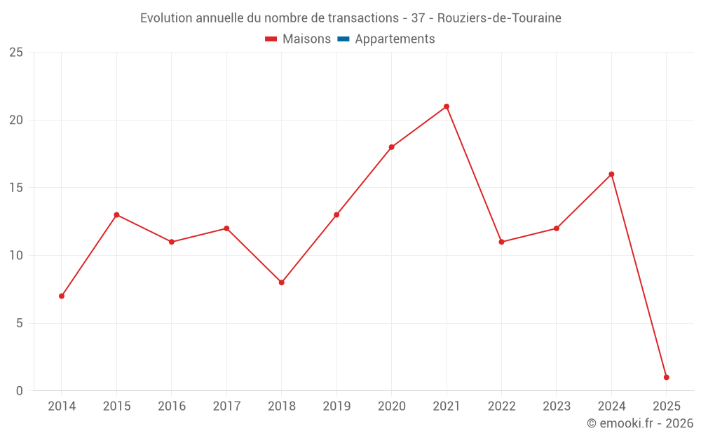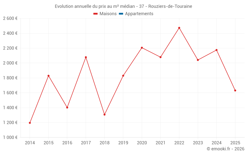 Le prix médian sur les 22 transactions de maisons des 24 derniers mois dans la commune de Rouziers-de-Touraine était de 2 175 € par mètre carré pour une valeur foncière médiane de 272 025 €. Sur cette période 60% des transactions se sont situées entre 1 784 et 2 639 € par mètre carré (du 2ème au 8ème déciles).