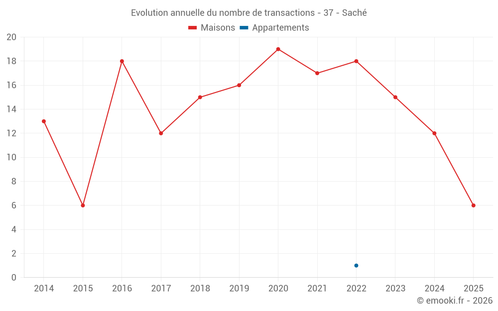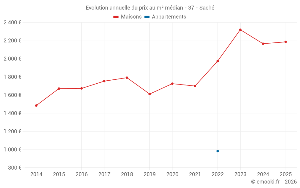 Le prix médian sur les 27 transactions de maisons des 24 derniers mois dans la commune de Saché était de 2 296 € par mètre carré pour une valeur foncière médiane de 205 000 €. Sur cette période 60% des transactions se sont situées entre 1 802 et 2 463 € par mètre carré (du 2ème au 8ème déciles).