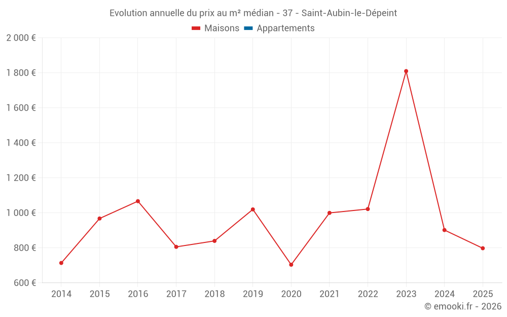 Le prix au m² des maisons a augmenté de 13% depuis 5 ans, mais il a diminué de 25% en 9 ans.