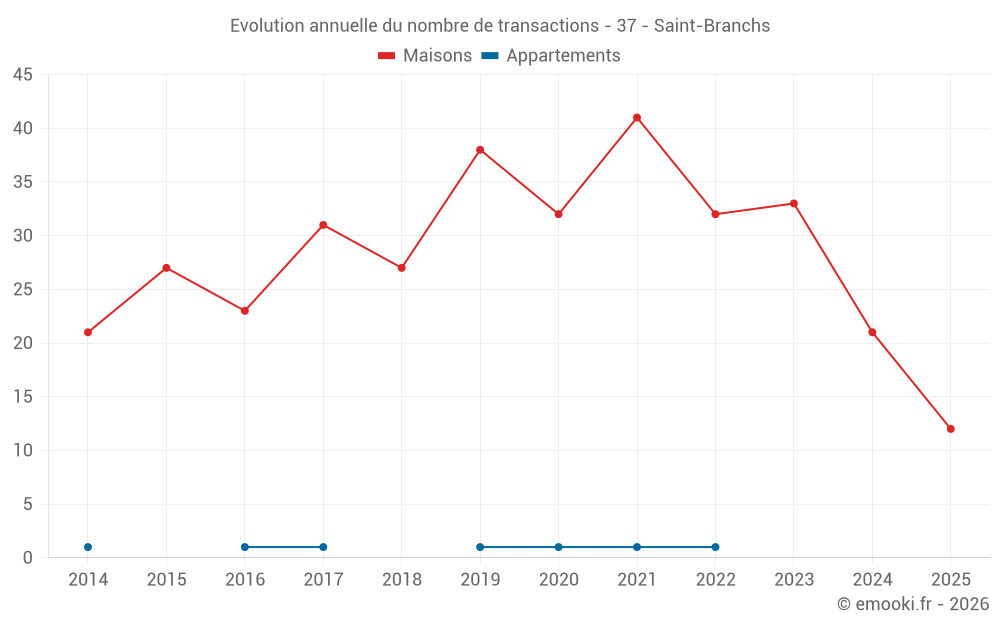 Le prix médian sur les 28 transactions de maisons des 12 derniers mois dans la commune de Saint-Branchs était de 2 114 € par mètre carré pour une valeur foncière médiane de 179 500 €. Sur cette période 60% des transactions se sont situées entre 1 669 et 2 603 € par mètre carré (du 2ème au 8ème déciles).