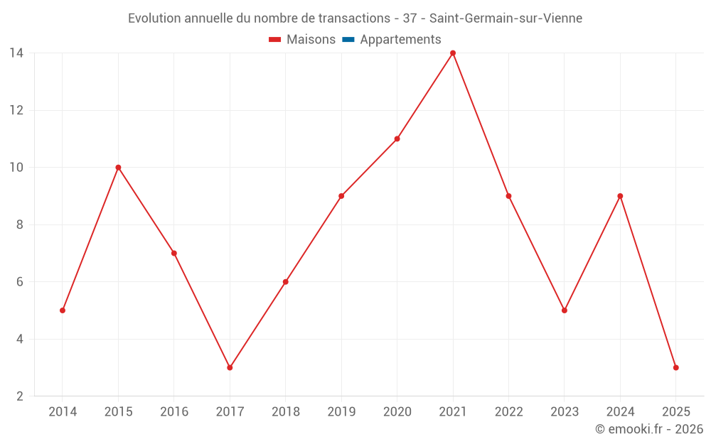 Le prix médian sur les 17 transactions de maisons des 24 derniers mois dans la commune de Saint-Germain-sur-Vienne était de 1 175 € par mètre carré pour une valeur foncière médiane de 120 000 €. Sur cette période 60% des transactions se sont situées entre 660 et 1 865 € par mètre carré (du 2ème au 8ème déciles).