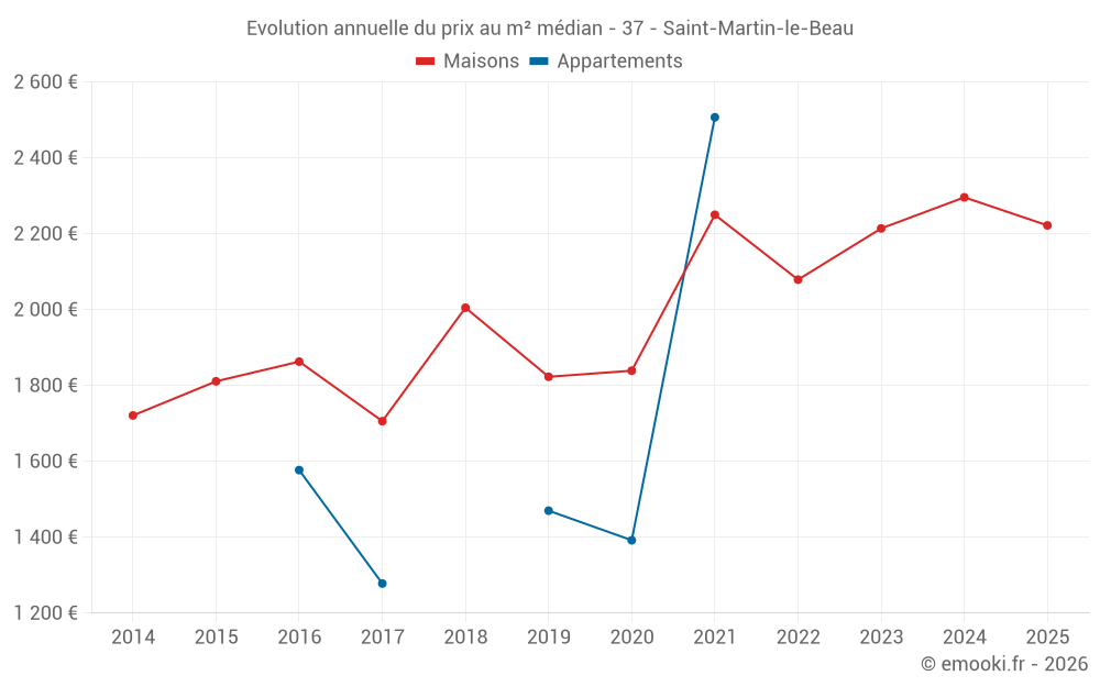Le prix médian sur les 29 transactions de maisons des 12 derniers mois dans la commune de Saint-Martin-le-Beau était de 2 278 € par mètre carré pour une valeur foncière médiane de 205 000 €. Sur cette période 60% des transactions se sont situées entre 1 825 et 2 659 € par mètre carré (du 2ème au 8ème déciles).