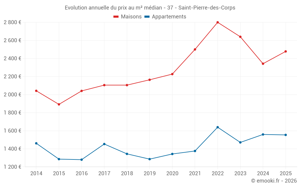 Le prix médian sur les 30 transactions de maisons des 6 derniers mois dans la commune de Saint-Pierre-des-Corps était de 2 478 € par mètre carré pour une valeur foncière médiane de 179 875 €. Sur cette période 60% des transactions se sont situées entre 1 440 et 2 839 € par mètre carré (du 2ème au 8ème déciles).