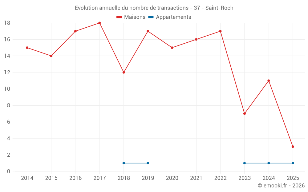 Le prix médian sur les 19 transactions de maisons des 24 derniers mois dans la commune de Saint-Roch était de 2 589 € par mètre carré pour une valeur foncière médiane de 290 000 €. Sur cette période 60% des transactions se sont situées entre 2 046 et 3 128 € par mètre carré (du 2ème au 8ème déciles).