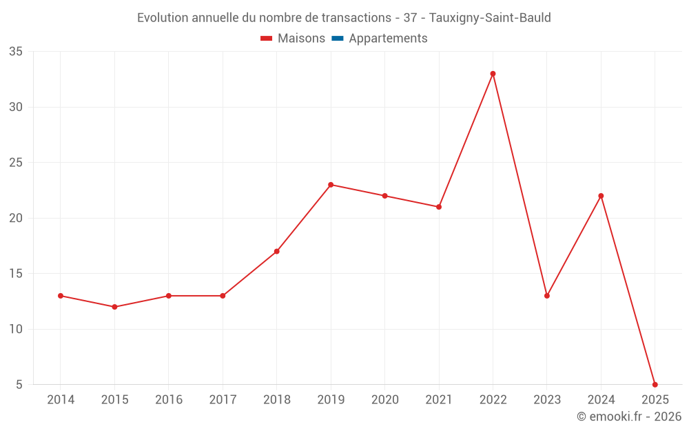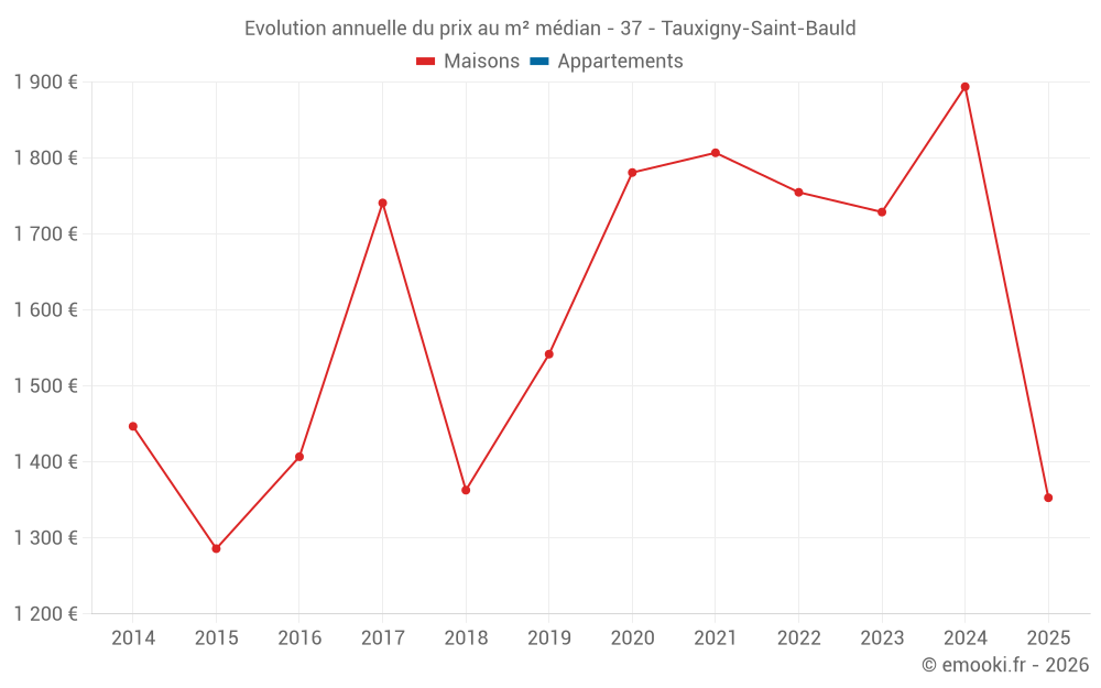 Le prix médian sur les 17 transactions de maisons des 12 derniers mois dans la commune de Tauxigny-Saint-Bauld était de 1 981 € par mètre carré pour une valeur foncière médiane de 176 500 €. Sur cette période 60% des transactions se sont situées entre 1 399 et 2 530 € par mètre carré (du 2ème au 8ème déciles).