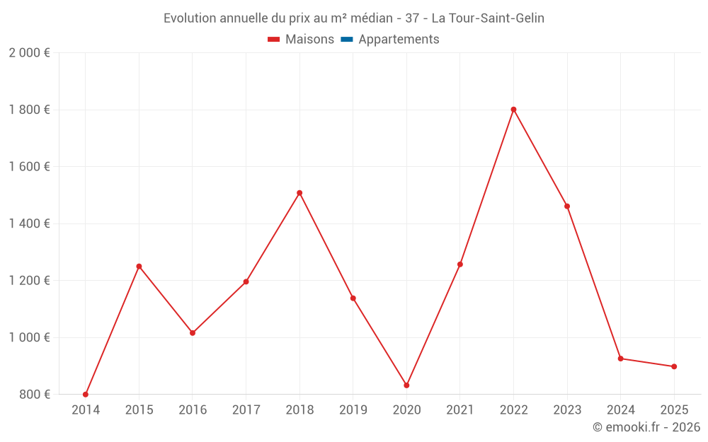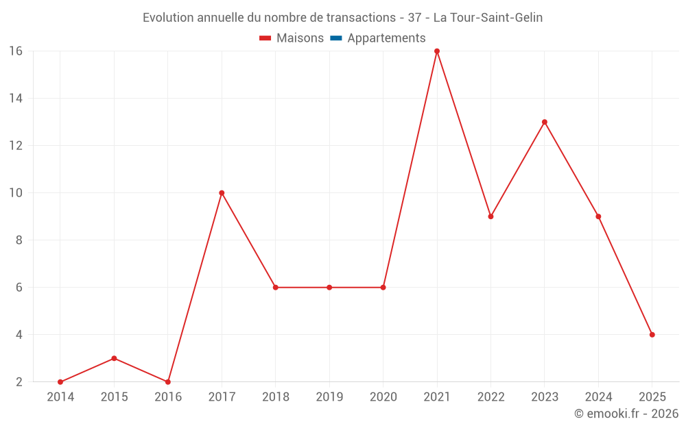 Le prix médian sur les 19 transactions de maisons des 24 derniers mois dans la commune de la Tour-Saint-Gelin était de 957 € par mètre carré pour une valeur foncière médiane de 90 000 €. Sur cette période 60% des transactions se sont situées entre 594 et 1 569 € par mètre carré (du 2ème au 8ème déciles).