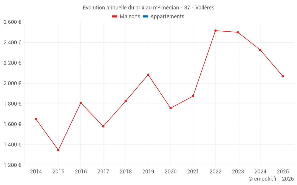 Le prix médian sur les 20 transactions de maisons des 24 derniers mois dans la commune de Vallères était de 2 320 € par mètre carré pour une valeur foncière médiane de 217 500 €. Sur cette période 60% des transactions se sont situées entre 1 558 et 2 900 € par mètre carré (du 2ème au 8ème déciles).