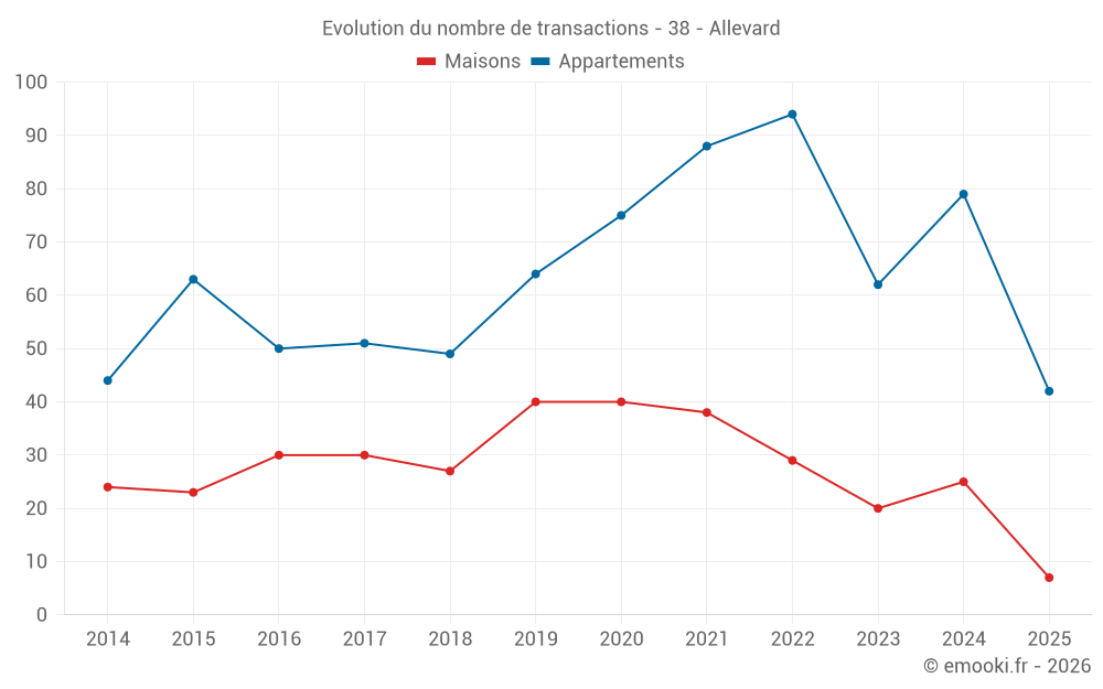 Attention, dernière année incomplète. Projections effectuées sur la base des proportions entre semestres de l'année précédente au niveau départemental/national et par catégorie de bien.