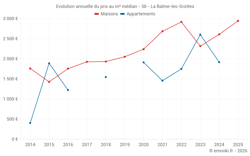 Le prix médian sur les 15 transactions de maisons des 24 derniers mois dans la commune de la Balme-les-Grottes était de 2 593 € par mètre carré pour une valeur foncière médiane de 246 980 €. Sur cette période 60% des transactions se sont situées entre 2 187 et 2 765 € par mètre carré (du 2ème au 8ème déciles).