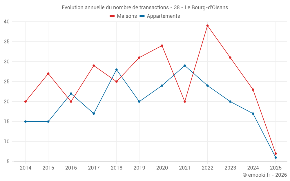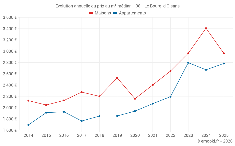Le prix médian sur les 20 transactions de maisons des 12 derniers mois dans la commune du Bourg-d'Oisans était de 3 058 € par mètre carré pour une valeur foncière médiane de 298 750 €. Sur cette période 60% des transactions se sont situées entre 2 443 et 3 918 € par mètre carré (du 2ème au 8ème déciles).