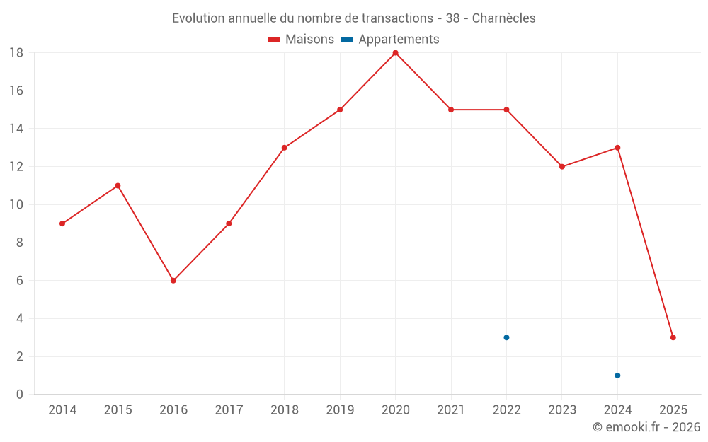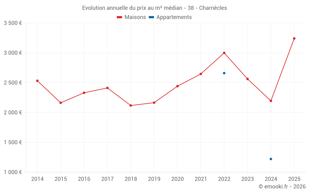 Le prix médian sur les 25 transactions de maisons des 24 derniers mois dans la commune de Charnècles était de 2 463 € par mètre carré pour une valeur foncière médiane de 322 450 €. Sur cette période 60% des transactions se sont situées entre 1 711 et 3 121 € par mètre carré (du 2ème au 8ème déciles).