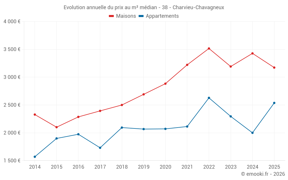 Le prix médian sur les 22 transactions de maisons des 6 derniers mois dans la commune de Charvieu-Chavagneux était de 3 172 € par mètre carré pour une valeur foncière médiane de 275 500 €. Sur cette période 60% des transactions se sont situées entre 2 439 et 3 777 € par mètre carré (du 2ème au 8ème déciles).