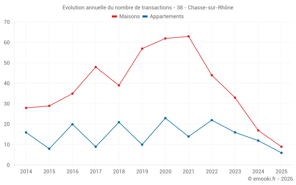 Le prix médian sur les 23 transactions de maisons des 12 derniers mois dans la commune de Chasse-sur-Rhône était de 3 165 € par mètre carré pour une valeur foncière médiane de 304 000 €. Sur cette période 60% des transactions se sont situées entre 2 262 et 3 645 € par mètre carré (du 2ème au 8ème déciles).