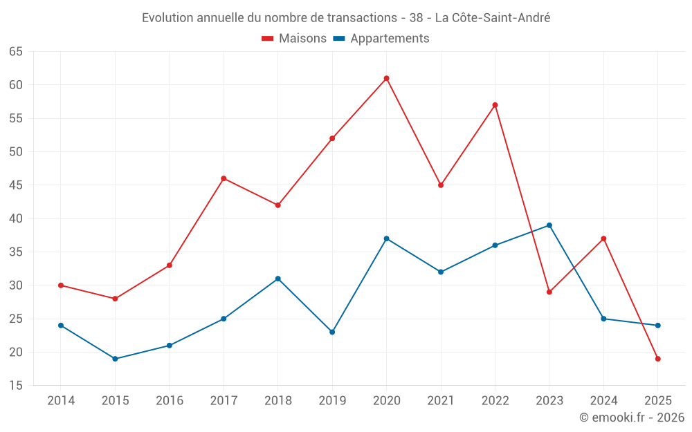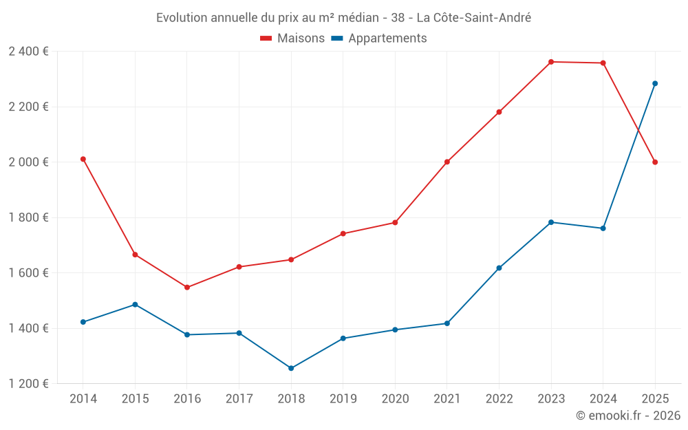 Le prix médian sur les 19 transactions de maisons des 6 derniers mois dans la commune de la Côte-Saint-André était de 2 000 € par mètre carré pour une valeur foncière médiane de 196 050 €. Sur cette période 60% des transactions se sont situées entre 1 519 et 2 629 € par mètre carré (du 2ème au 8ème déciles).