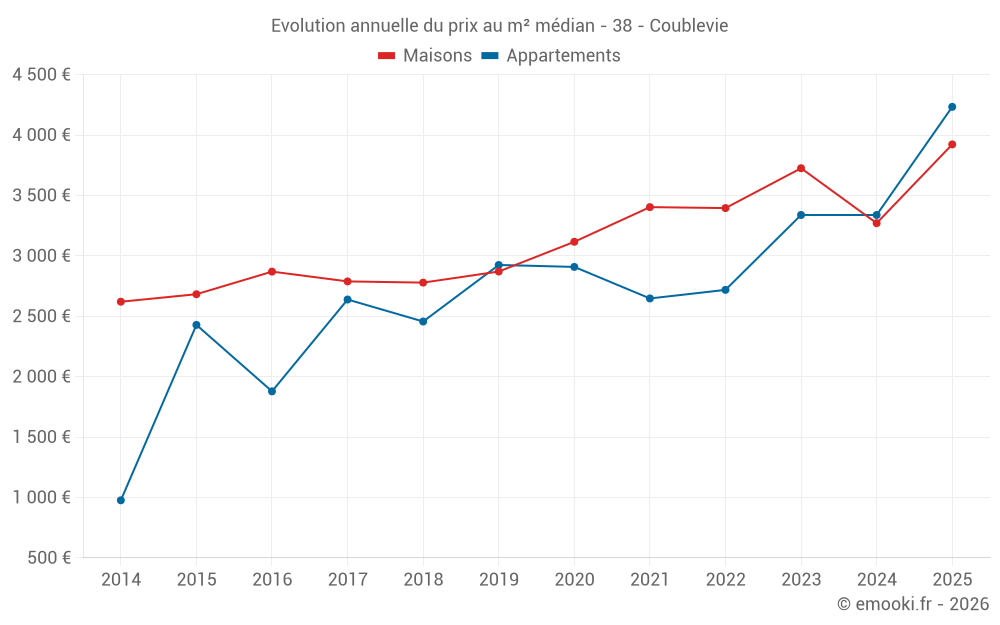 Le prix médian sur les 18 transactions d'appartements des 24 derniers mois dans la commune de Coublevie était de 3 490 € par mètre carré pour une valeur foncière médiane de 250 465 €. Sur cette période 60% des transactions se sont situées entre 3 004 et 4 036 € par mètre carré (du 2ème au 8ème déciles).