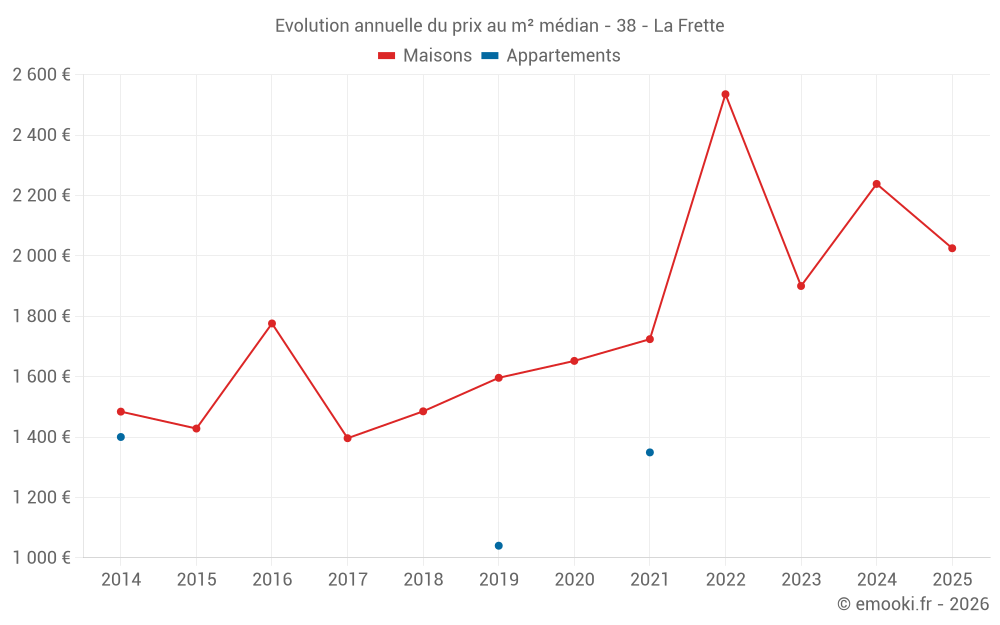 Le prix médian sur les 15 transactions de maisons des 24 derniers mois dans la commune de la Frette était de 2 143 € par mètre carré pour une valeur foncière médiane de 185 000 €. Sur cette période 60% des transactions se sont situées entre 1 518 et 2 698 € par mètre carré (du 2ème au 8ème déciles).