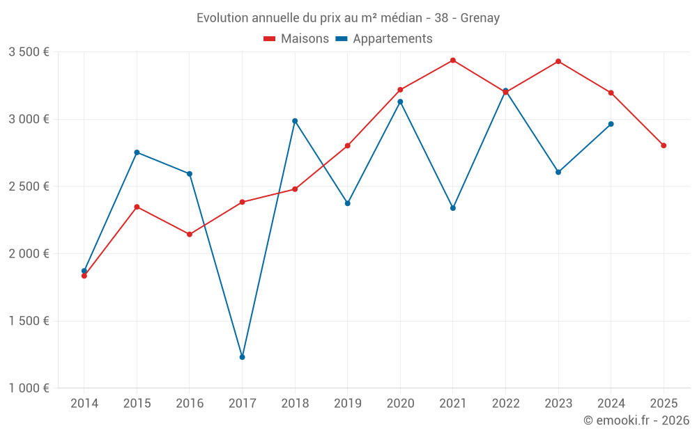 Le prix médian sur les 28 transactions de maisons des 24 derniers mois dans la commune de Grenay était de 3 301 € par mètre carré pour une valeur foncière médiane de 317 150 €. Sur cette période 60% des transactions se sont situées entre 2 103 et 3 800 € par mètre carré (du 2ème au 8ème déciles).