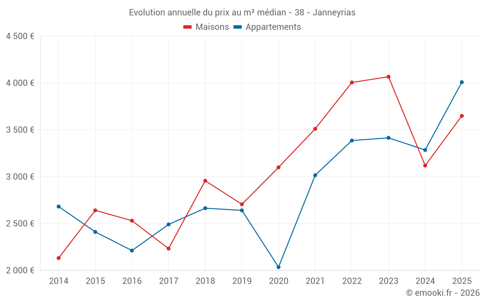 Le prix médian sur les 16 transactions de maisons des 24 derniers mois dans la commune de Janneyrias était de 3 480 € par mètre carré pour une valeur foncière médiane de 292 435 €. Sur cette période 60% des transactions se sont situées entre 2 388 et 4 633 € par mètre carré (du 2ème au 8ème déciles).