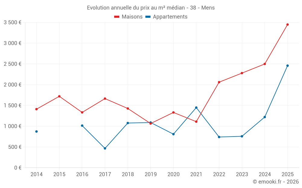 Le prix médian sur les 28 transactions de maisons des 24 derniers mois dans la commune de Mens était de 2 380 € par mètre carré pour une valeur foncière médiane de 172 500 €. Sur cette période 60% des transactions se sont situées entre 1 823 et 3 122 € par mètre carré (du 2ème au 8ème déciles).