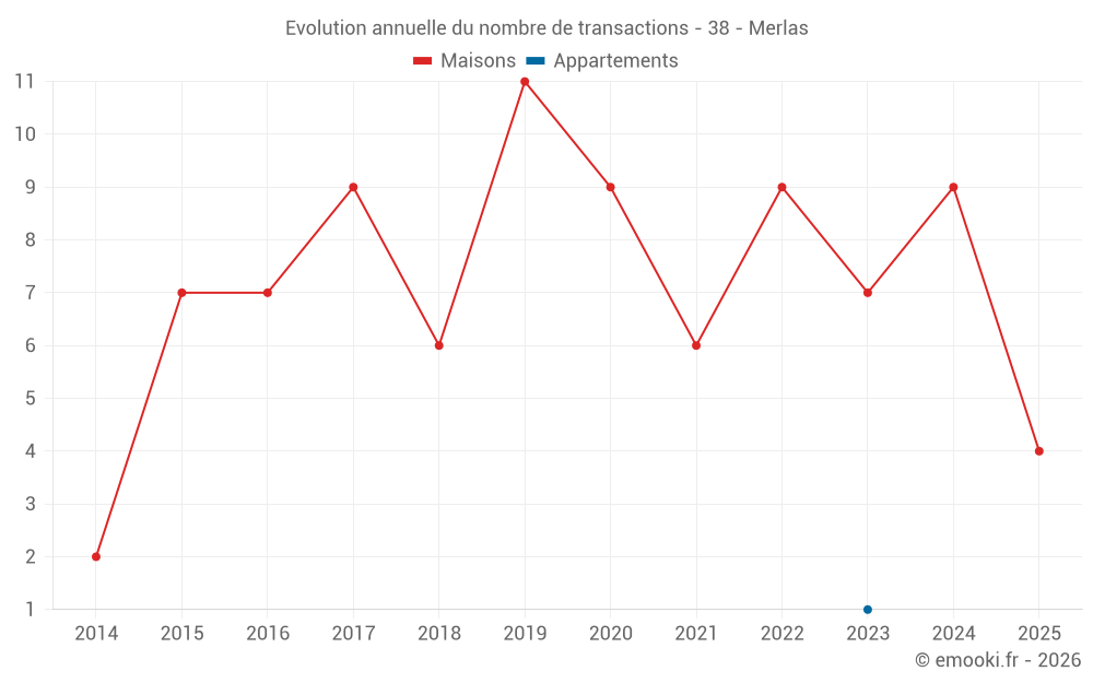 Le prix médian sur les 14 transactions de maisons des 24 derniers mois dans la commune de Merlas était de 1 960 € par mètre carré pour une valeur foncière médiane de 210 250 €. Sur cette période 60% des transactions se sont situées entre 1 270 et 2 741 € par mètre carré (du 2ème au 8ème déciles).