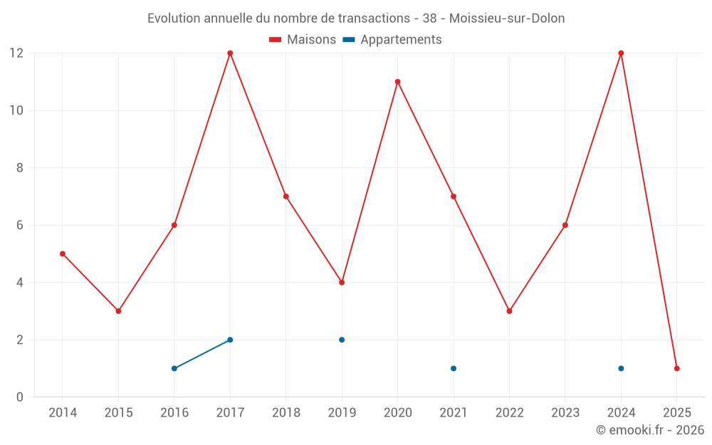 Le prix médian sur les 14 transactions de maisons des 24 derniers mois dans la commune de Moissieu-sur-Dolon était de 2 416 € par mètre carré pour une valeur foncière médiane de 241 900 €. Sur cette période 60% des transactions se sont situées entre 1 798 et 2 565 € par mètre carré (du 2ème au 8ème déciles).