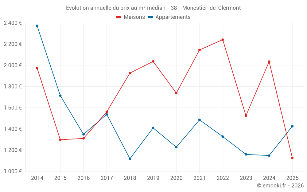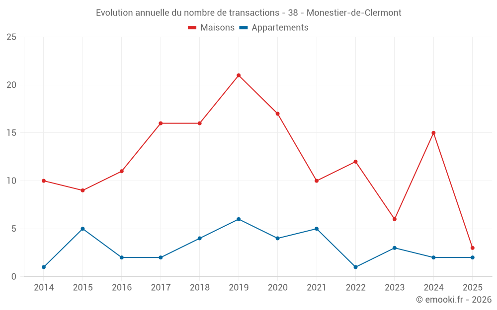 Le prix médian sur les 19 transactions de maisons des 24 derniers mois dans la commune de Monestier-de-Clermont était de 1 767 € par mètre carré pour une valeur foncière médiane de 224 990 €. Sur cette période 60% des transactions se sont situées entre 1 237 et 2 314 € par mètre carré (du 2ème au 8ème déciles).