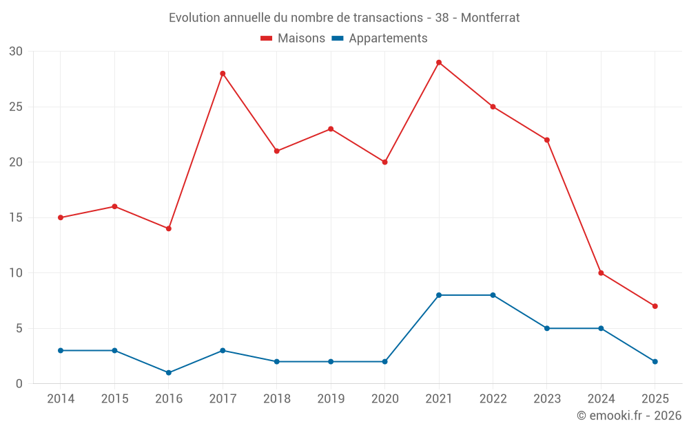 Le prix médian sur les 27 transactions de maisons des 24 derniers mois dans la commune de Montferrat était de 2 465 € par mètre carré pour une valeur foncière médiane de 237 000 €. Sur cette période 60% des transactions se sont situées entre 1 287 et 3 167 € par mètre carré (du 2ème au 8ème déciles).