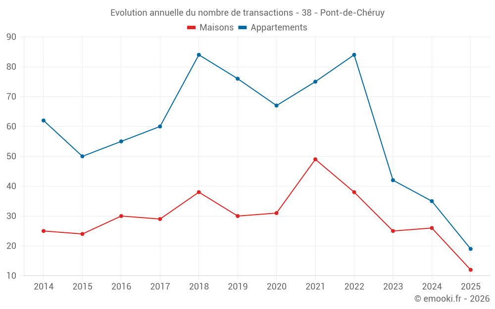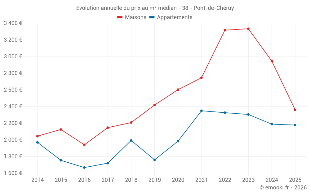Le prix médian sur les 23 transactions de maisons des 12 derniers mois dans la commune de Pont-de-Chéruy était de 2 922 € par mètre carré pour une valeur foncière médiane de 265 000 €. Sur cette période 60% des transactions se sont situées entre 2 159 et 3 171 € par mètre carré (du 2ème au 8ème déciles).
