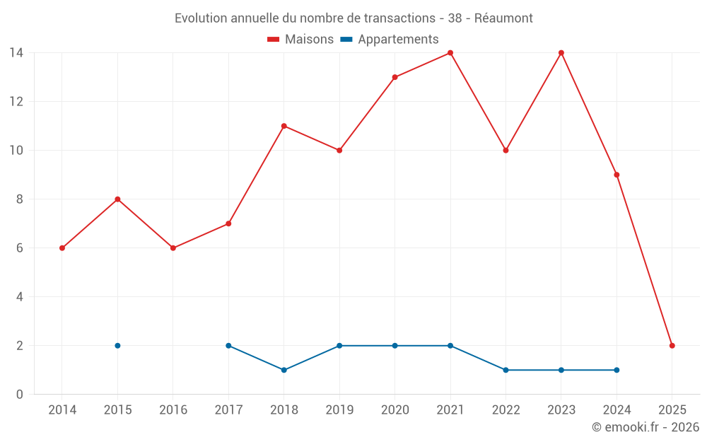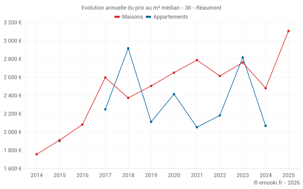 Le prix médian sur les 17 transactions de maisons des 24 derniers mois dans la commune de Réaumont était de 2 954 € par mètre carré pour une valeur foncière médiane de 352 000 €. Sur cette période 60% des transactions se sont situées entre 1 590 et 3 576 € par mètre carré (du 2ème au 8ème déciles).