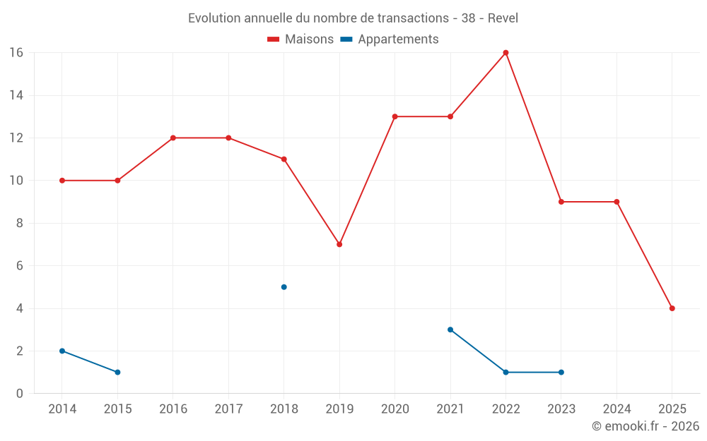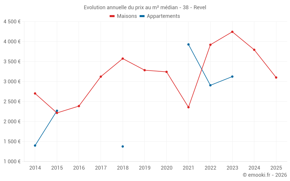 Le prix médian sur les 17 transactions de maisons des 24 derniers mois dans la commune de Revel était de 3 575 € par mètre carré pour une valeur foncière médiane de 401 620 €. Sur cette période 60% des transactions se sont situées entre 2 902 et 4 350 € par mètre carré (du 2ème au 8ème déciles).