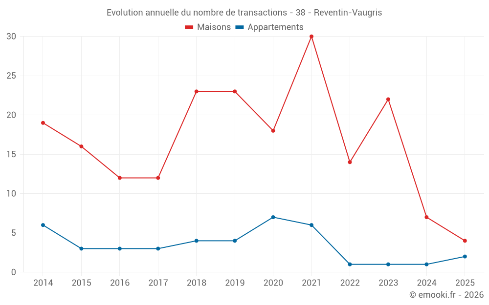 Le prix médian sur les 24 transactions de maisons des 24 derniers mois dans la commune de Reventin-Vaugris était de 2 822 € par mètre carré pour une valeur foncière médiane de 274 250 €. Sur cette période 60% des transactions se sont situées entre 2 025 et 3 295 € par mètre carré (du 2ème au 8ème déciles).
