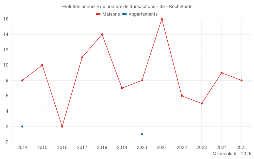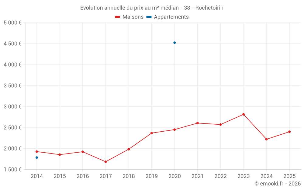 Le prix médian sur les 17 transactions de maisons des 24 derniers mois dans la commune de Rochetoirin était de 2 329 € par mètre carré pour une valeur foncière médiane de 235 000 €. Sur cette période 60% des transactions se sont situées entre 1 706 et 2 850 € par mètre carré (du 2ème au 8ème déciles).